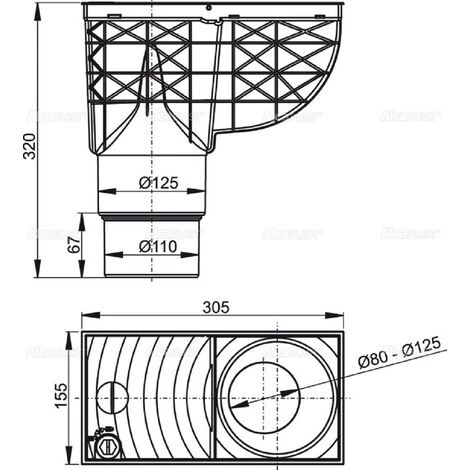 - Connection verticale avec la canalisation – 110mm, 125mmompatible avec les tuyaux 80, 90, 100, 110 et 125 mm