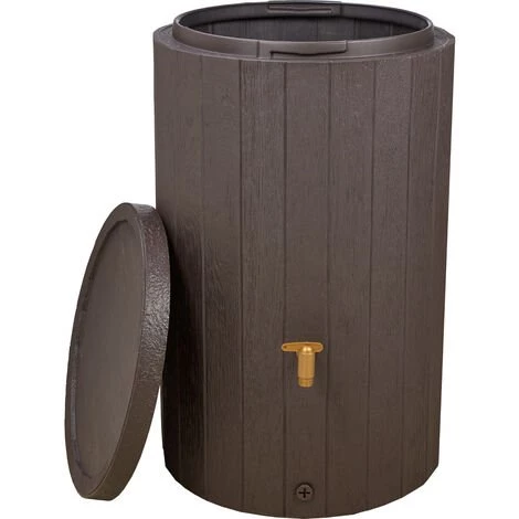 Ce réservoir de stockage d’eau de pluie à l’aspect d’un tonneau en bois et une capacité de 220 litres.