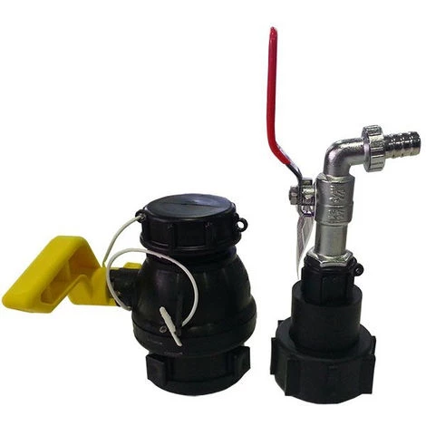 Pack comprenant une vanne à boisseau sphérique , haute résistance , avec écrou S75x6 ( 70mm ) , un robinet en laiton avec sortie de 19mm monté sur un raccord changement de pas en polypropylène chargé fibre de verre.