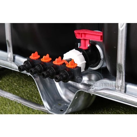 Cet ensemble est composé du bouchon adaptateur, d’une quadruple sortie arrosage mâle avec vanette 1/4 tour séparée pour connecter directement vos tuyaux d’arrosage à votre cuve de récupération d’eau.