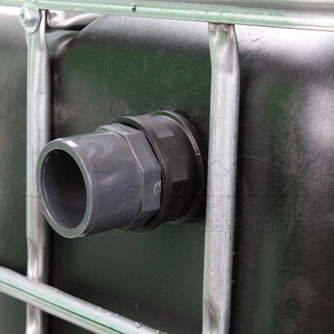 Raccord passe paroi installé en partie haute d’une cuve de récupération d’eau avec branchement sur tuyau PVC à coller de :